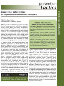 The California Department of Health Care Services (DHCS), in alignment with the U.S. Department of Health and Human Services, Substance Abuse and Mental Health Services Administration (SAMHSA), is prioritizing integration and coordination of prevention services in public health, mental health, social services, juvenile justice, and education for youth and families with multiple areas of need. This Tactic highlights two counties in California that are implementing cross-sector collaboration in unique ways. Using diverse strategies, these communities are creating innovative programs and notable outcomes despite our current climate of budgetary restrictions. The Tactic also provides recommendations and resources to support communities in strengthening cross-sector collaboration on a local level.