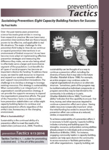 The goal of this Prevention Tactic is to demonstrate how prevention stakeholders can utilize eight capacity building factors to continue and expand prevention efforts regardless of the entity’s size, bureaucracy or the changing environment. To demonstrate how capacity building can enhance the likelihood of sustaining prevention efforts, this Tactic examines three diverse entities that have achieved sustainability success. Representatives from three prevention-based efforts were interviewed in order to better understand their success in sustaining their respective programs.